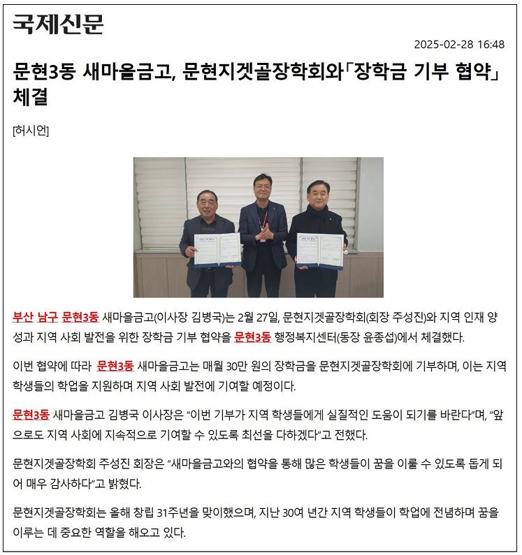 문현3동새마을금고, 문현지겟골장학회와 「장학금 기부 협약」체결